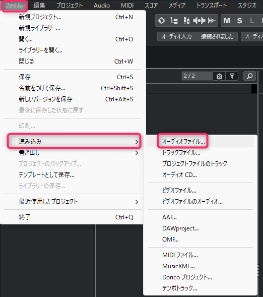 『読み込み』→『オーディオファイル』で該当のファイルを選択するか