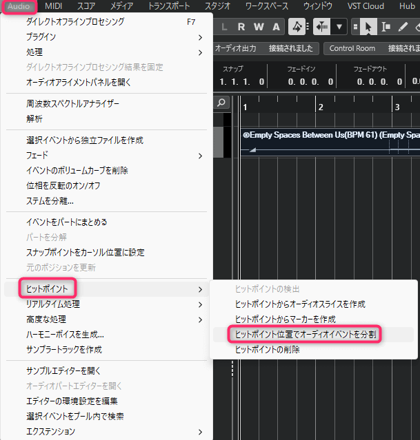 『ヒットポイント位置でオーディオイベントを分割』を選択します。