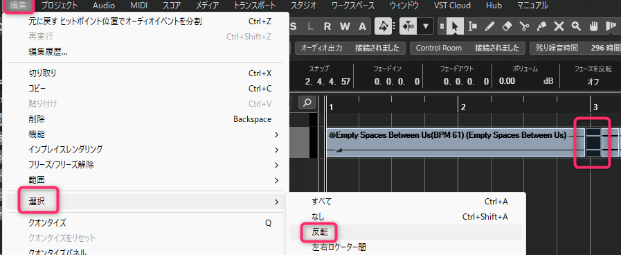 『選択』→『反転』→『削除』を進めると、楽曲全体のファイルやコードトラックも選択されて