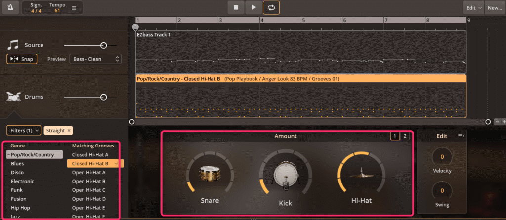 『Amount』ではキック、スネア、ハイハットの手数も調整できます。